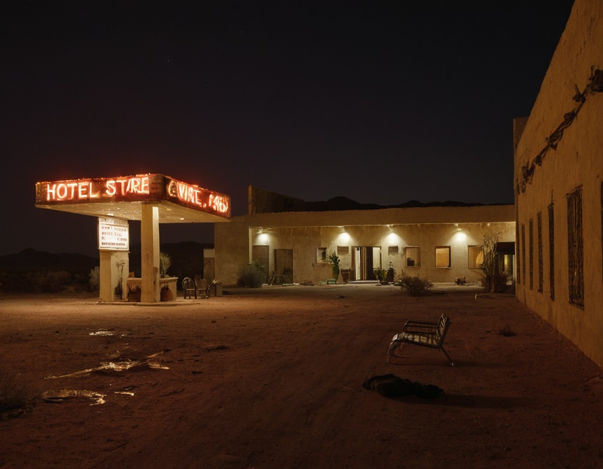 The hotel was just beyond a long curve in the road. I saw a cheap sign on top of a trailer by the curb advertising the rooms for $59 a night including air conditioning and cable television. Some of the letters were missing and the trailer’s tire was flat, this town has a lot of cheap, broken-down signs. I pulled in and noticed two other cars where there, probably the manager and someone else.